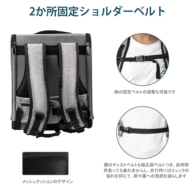 大容量&お手入れも簡単:</br>新登場大容量のペットバックは内部空間が広いだから、出かけの時、窮屈感とバイバイし、ペットに安全で快適な体験を与えます。内部に敷いてあるマットは、取り外し可能で手入サイズ:41*35*29cm。猫と小型犬などペットも適用します(推奨体重:3~10kg ※ペットの体格をお確かめください)。</br>高品質素材:</br>高品質の生地を採用して、縫い目が細くて縫製は丈夫で破れにくいです。。バックパックの両側にはポケットがあり、ペットのスナックやおもちゃを置くことができます。本体の背面にS型減圧のチェストベルトを設置させていただきますから、肩との接触面積を増やし、体の負担を軽減します。安定性向上することもできます。</br>多用途:</br>リュックサックは両手を解放してくれます。犬猫の通院、避難、電車乗りなどの出かけ用品として、大事なペットの命を守ることができます。使用しない場合、ペットバッグを折りたたんで、空間節約で便利に収納できます。軽量で折りたたみやすいので、どこへ行っても楽で便利です。