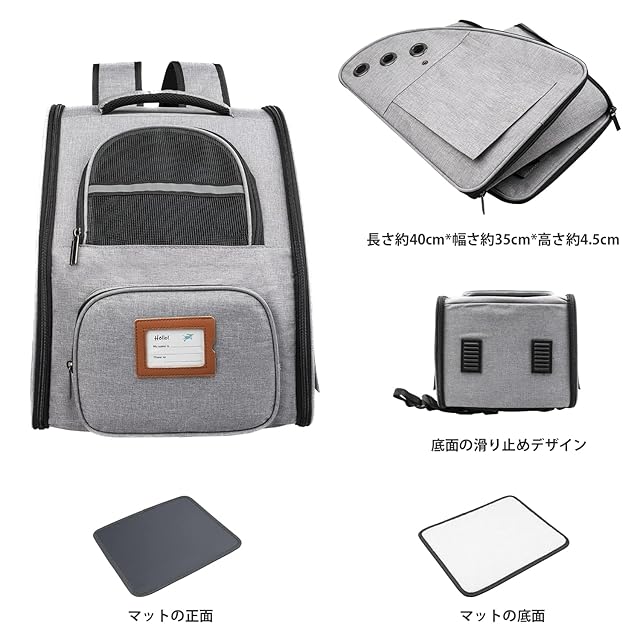 商品名:最新型 犬 猫 リュック メッシュ窓3つ カーテン付き 強通気性 飛び出し防止リード マット付き 強安定性 ペットキャリーバッグ お出かけ 小動物用 折り畳可 電車移動散歩 旅行 病院 災害避難に適用 耐荷重 8kg 軽量 グレー Funshare