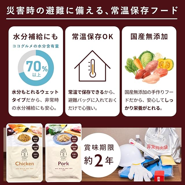 【災害時の備蓄として】冷凍のココグルメのおいしさはそのまま、未開封・常温保存で約2年の保存が可能です。災害時の備蓄やお出かけ時の持ち運びにも便利です。