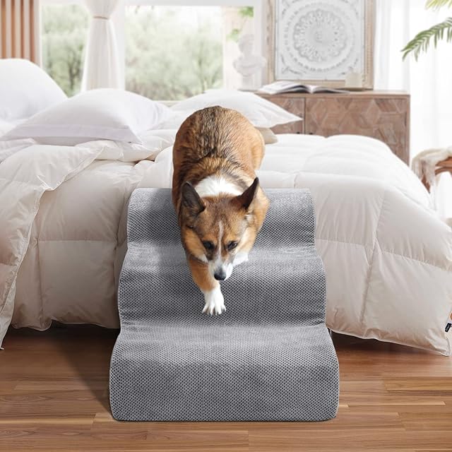 犬用ステップ 3段 ドッグステップ 犬用スロープ 犬用踏み台 犬用階段 小型犬 室内犬 高齢犬 滑り止めマット付き カバー取り外し 洗える 手持ち付き(グレー)