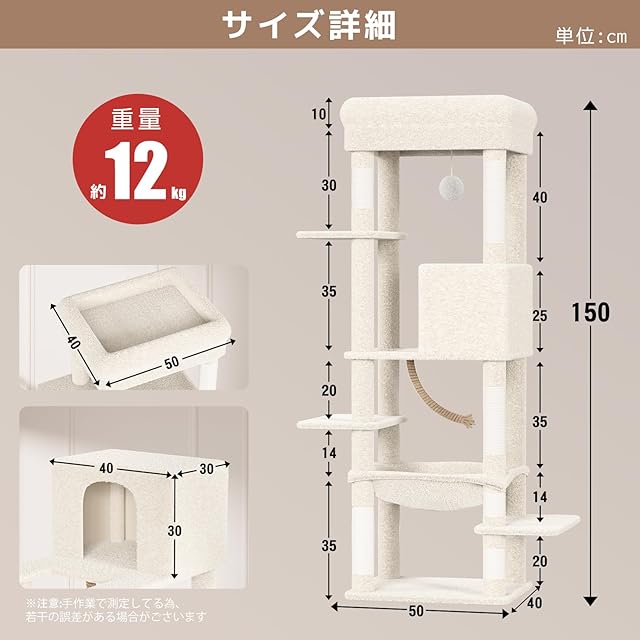 【多機能キャットタワー】スリムな据え置き型50×40×150cmの猫タワーは、つめとぎ・キャットウォーク・ジャンプ・ベッド機能を一体化。高密度シザルロープを採用したつめとぎ柱に、広々猫用ハウスと雲型クッション付きハンモックを組み合わせ、ステップ式で子猫から大型猫用まで満足させる。運動不足解消とストレス緩和に最適な人気デザイン。
