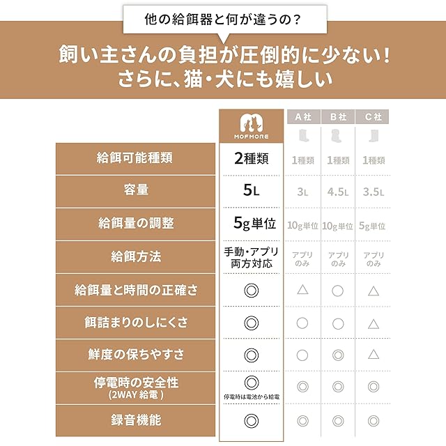 商品名:2種類出せる MOFMORE 自動給餌器 猫 犬 2匹 音声録音 5L大容量 1日10食 多頭飼い スマホ操作 餌 ペット 自動えさやり器 給餌機 タイマー式 Wifi アプリ管理 定時定量 ステンレス製トレイ 水洗い可 モフモア