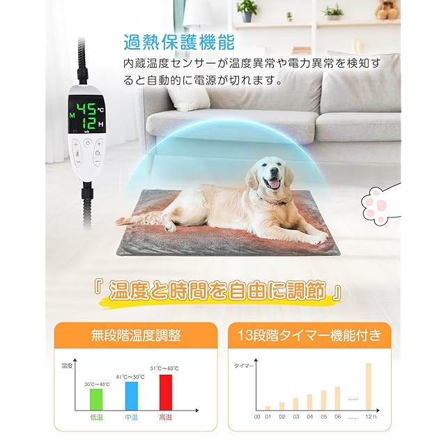 商品名:ペット用ホットカーペット ペットヒーター 猫 犬 ペットマット 30℃~60℃温度調節可能 12Hタイマー機能 ホットカーペット ヒーターマット ホットマット 噛み癖対策 過熱保護 カバー洗濯可能 暖房器具 寒さ対策 大小動物対応 あったか PSE認証済み