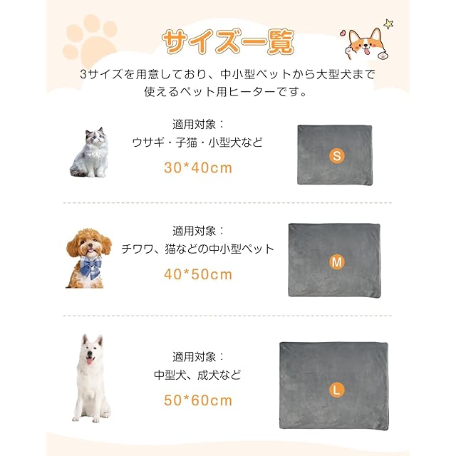 【3サイズ&安心な品質】S(30×40cm)/L(40×50cm)/L(50×6cm)、小型犬やネコから大型犬まで使えるペット用ヒーターです。特に妊娠中や授乳中のペット、または介護が必要あるペットに最適!弊社は出荷前に品質検査を行っております。購入日から六ヶ月間以内に初期不良が発生しましたら、弊社までお気軽にご連絡くださいませ。交換・返金対応しますので、安心してご購入ください。