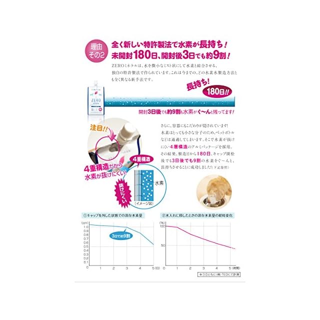 【水素が長持ちする理由とは?】水素の保持期限は水素水の製造方法により大きく異なります。ZEROミネラルは圧力をかけて水と水素を強く結びつける加圧式製法のため溶存水素量は1.6ppm(充填時)、水素保持期限は180日(未開封)。その上、容器は水素が抜けにくいアルミパウチの為、社内実験において開封後も3日間は約90%、水飲み皿に注いで5時間後も約半分の水素を維持しました。