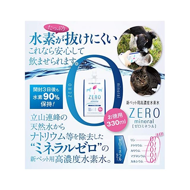 【ZEROミネラルが選ばれる3つの理由】</br></br><1>北アルプス天然水からナトリウム、カルシウム等のミネラルを除去。硬度0の軟水で作ったペット水素水です!</br>シニア期の猫や犬の水分補給において、ミネラルの過剰摂取には注意が必要です。このペット水素水はROフィルター(逆浸透膜)により不純物とミネラルを除去。少しでもいい飲み水を与えたいペットオーナーから選ばれています。</br></br><2>水素が長持ち!開封後3日後も約90%、加温してふやかしフードにも!</br>水素水は製造技術により水素の保持期限に差が出ます。このペット水素水は水を微小なミスト状にして水素をたっぷり結合させる加圧式製法のため、水素が長持ちします。また約60℃まで加温可能なので、飲み水だけでなくドライフードをふやかすお水にも。冷凍保存も可能です。</br></br><3>北アルプスのおいしい地下天然水を使用、ゴクゴク飲みっぷりが違います!</br>名水の宝庫と呼ばれる、富山・立山連峰の地下天然水(軟水)を使用。そのまま飲んでもおいしい天然水の旨みを生かし、まろやかで飲みやすいお水に仕上がりました。もちろん化学処理は一切行っておりません。