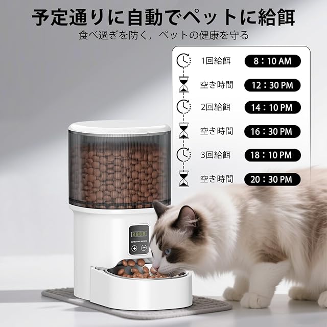 【かんたん設定・自動給餌】 設定はとても簡単で、スマホが苦手な方や機械が得意でない方でも安心して使えます。1日1〜6回の給餌時間を、ボタン操作だけで簡単に設定可能。タイマーは一度セットすれば、自動で繰り返し作動するため、外出中でも安心です。早食いや食べ過ぎの防止にも効果的です。