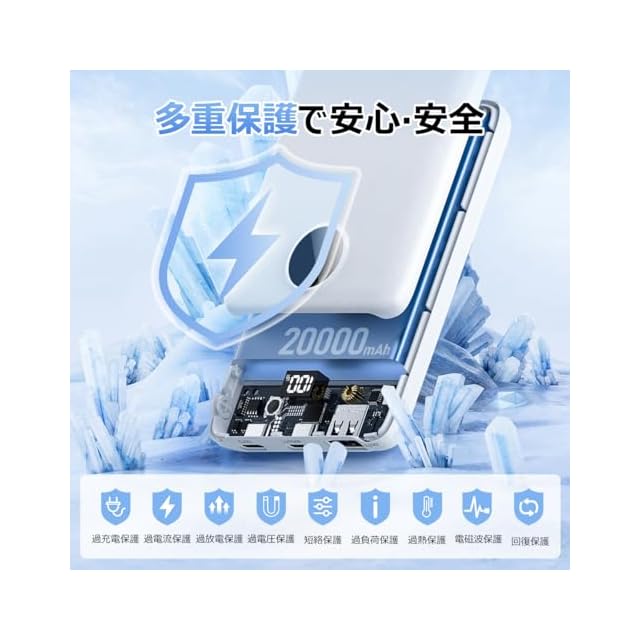 【多重安全保護機能つき·Smart-IC検知機能】本製品が高性能ICチップと安全装置が内蔵されており、発熱防止に効果的なだけでなく、出力過圧保護/出力過電流保護/出力短絡保護/入力過圧保護/入力過電流保護/電池過充電保護/電池過圧保護/電池過放電保護など計多重の安全保護措置を備え、安全と性能を一体化した完璧なモバイルバッテリーです。また、低電流モードも搭載されており、スマートフォンやタブレットはもちろん、スマートウォッチやワイヤレスイヤホン等の小型電子機器にも最適な電流で充電することができます。コンセントのない場所でも手軽に充電できるため、安心して出かけることが可能!(※ご注意:低電流モードのオン / オフの詳細は説明書をご覧ください。)