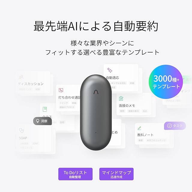 【多機能でスマートな専用アプリ】現在、Plaudのデバイスを購入し、専用アプリ「Plaud」に接続すると、300分/月のAI文字起こし&要約機能込みの無料スタータープランを利用できます。音声を文字起こしし、GPT-5/Claude 4.0/Gemini 2.5 Pro/o3-miniによる15種以上の要約形式(随時更新中)やマインドマップを生成できます。また、ファイル管理、AI人声強化、発言者識別、音声トリミングや探す機能など、幅広い機能を誰でも無料で利用できます。*文字起こし時間の追加や、専門領域のテンプレート、カスタムテンプレート、Ask AIやAI提案などのプレミアム機能を利用するには、アプリ内で有料のプロプラン(1200分/月)もしくは無制限プランにアップグレードしてください。