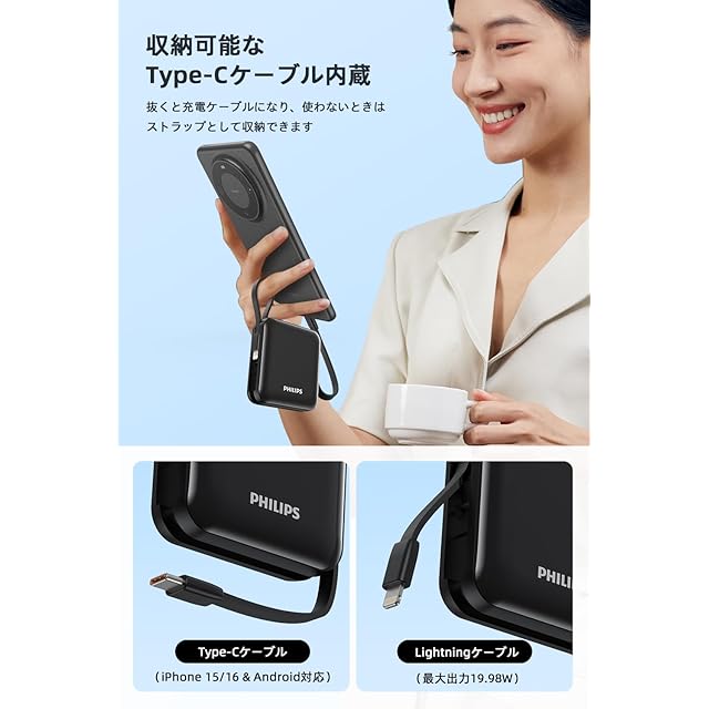 商品名:Philips (フィリップス) モバイルバッテリー 10000mAh 大容量 小型 携帯充電器 Lightning type-c ケーブル内蔵 22.5W 急速充電 タイプc ライトニング 4台同時充電 スマホ 持ち運び iPhone 16 / 15 Android iPad 各種機器対応 PSE認証済 (ブラック)