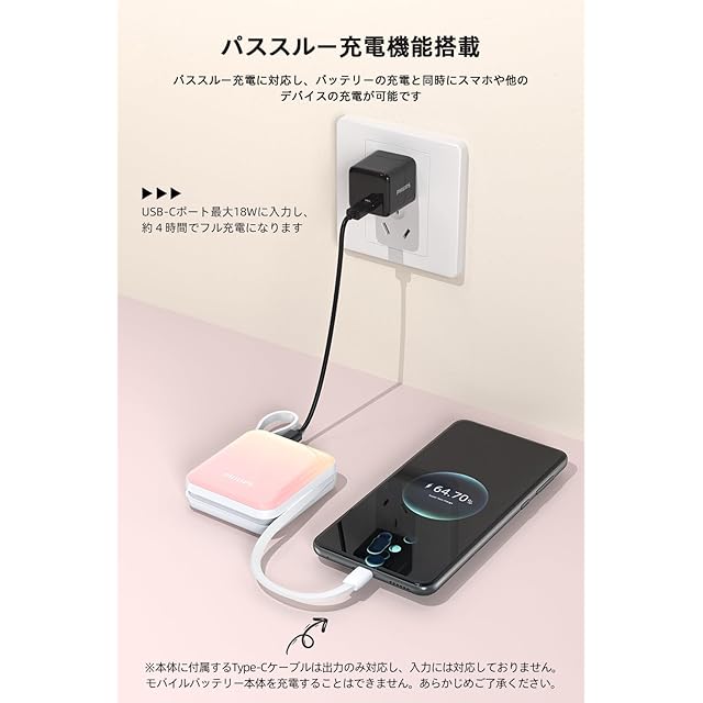 商品名:Philips (フィリップス) モバイルバッテリー 10000mAh 大容量 小型 携帯充電器 Lightning type-c ケーブル内蔵 22.5W 急速充電 タイプc ライトニング 4台同時充電 スマホ 充電器 持ち運び iPhone 16 / 15 Android iPad 各種機器対応 PSE認証済 (ピンク黄)
