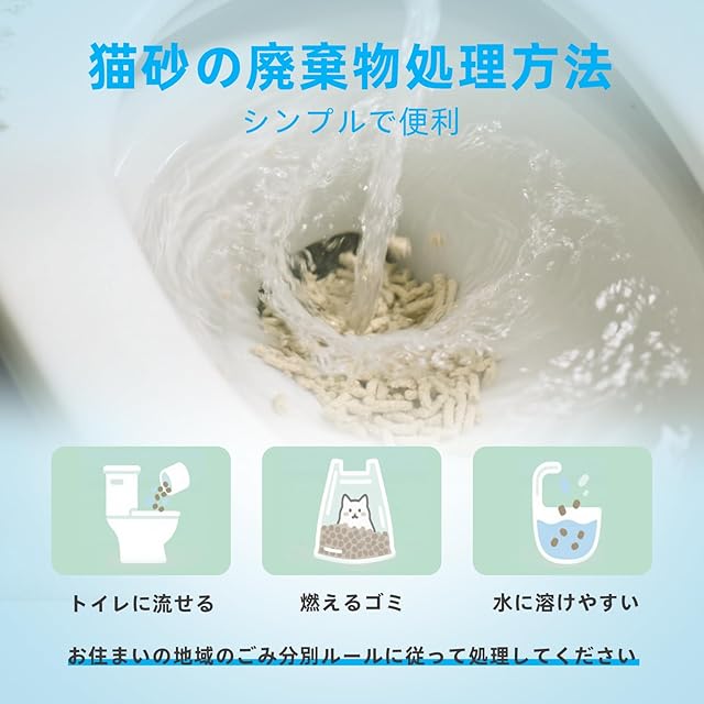 4.【自然な香り・可燃ゴミ対応・トイレ処理も可能】 天然植物由来の原料を使用し、ほんのりとした自然な香りで猫ちゃんにもやさしく、毎日のトイレタイムに安心してお使いいただけます。 使用後に固まった猫砂は、少量ずつトイレに流すことが可能です(※一度に大量に流すと詰まりの原因となるためご注意ください)。また、可燃ゴミとして処分できるため(※処理方法は自治体によって異なる場合があります。事前にご確認ください)、手間のかかる分別処理は不要です。 猫砂 鉱物のように不燃ゴミとして処理する必要がなく、木製や紙製の猫砂に見られるような固まりにくさや、尿が底に溜まるといった問題もありません。 Zutto Nyanの4in1おからミックス猫砂は、独自の粒子設計により粉化しにくく、飛び散りも最小限に抑えられており、お掃除もより簡単・快適になります。