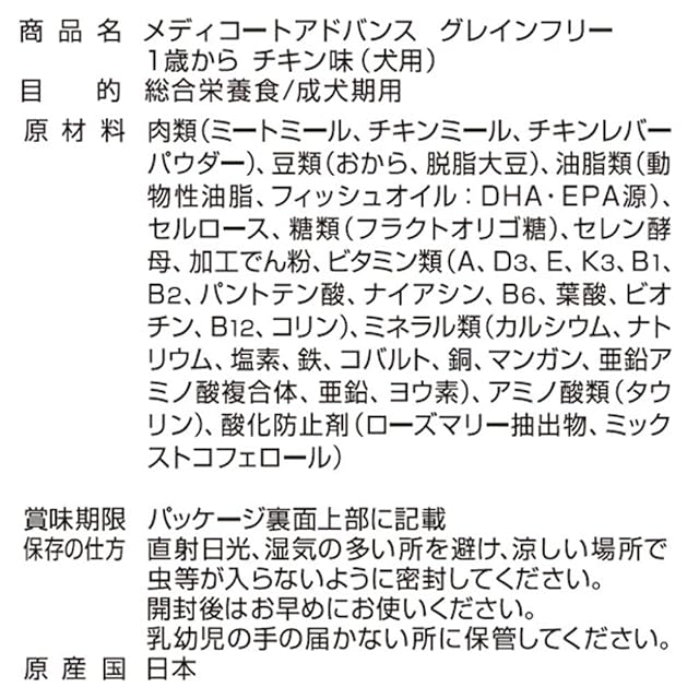 商品名:メディコートアドバンス グレインフリー 1歳から チキン味【国産/アルミ小分け】 6kg(500g×12)