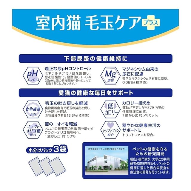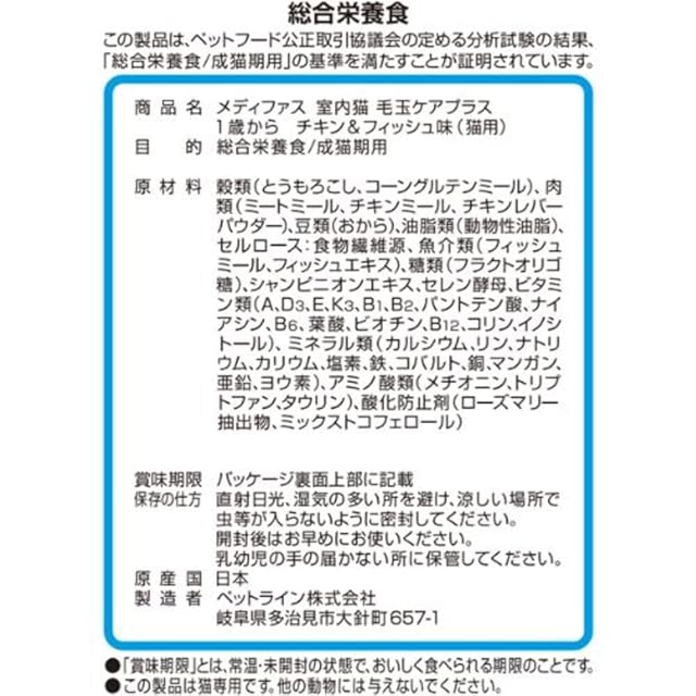 商品名:メディファス キャットフード 室内猫 毛玉ケアプラス 1歳から チキン&フィッシュ味 【下部尿路/pHコントロール/麻布大学共同開発/国産/アルミ小分け】 705g(235g×3)