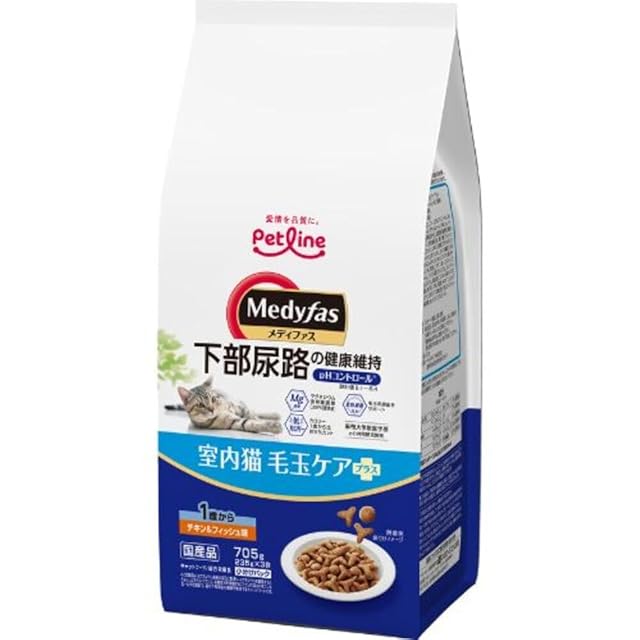 メディファス キャットフード 室内猫 毛玉ケアプラス 1歳から チキン&フィッシュ味 【下部尿路/pHコントロール/麻布大学共同開発/国産/アルミ小分け】 705g(235g×3)