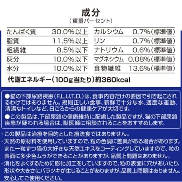 穀類(とうもろこし、コーングルテンミール)、肉類(ミートミール、チキンミール、チキンレバーパウダー)、豆類(おから)、油脂類(動物性油脂)、セルロース、魚介類(フィッシュミール、フィッシュエキス)、糖類(フラクトオリゴ糖)、卵類(ヨード卵粉末)、シャンピニオンエキス、ビタミン類(A、D3、E、K3、B1、B2、パントテン酸、ナイアシン、B6、葉酸、ビオチン、B12、コリン、イノシトール)、ミネラル類(カルシウム、リン、ナトリウム、カリウム、塩素、鉄、コバルト、銅、マンガン、亜鉛、ヨウ素)、アミノ酸類(メチオニン、トリプトファン、タウリン)、酸化防止剤(ローズマリー抽出物、ミックストコフェロール)