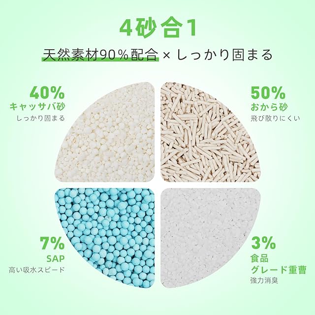 4.【天然植物由来&ナチュラルな香り|可燃ゴミ&トイレ処理対応でお掃除ラクラク】 ZuttoNyanの4in1キャッサバ 猫砂は、90%以上が天然植物成分でできており、人工香料を一切使用せず、素材本来のやさしい香りをそのまま残しています。香りに敏感な猫ちゃんにも安心してご使用いただけます。使用後の固まりは、少量ずつトイレに流すことが可能(※一度に大量に流すと詰まりの原因になるためご注意ください)。また、可燃ゴミとして処分可能で、後処理も手軽です。一方、鉱物系のベントナイト 猫砂は不燃ゴミとしての処理が必要で手間がかかり、木製タイプや紙製猫砂は固まりにくく、尿が底に溜まりやすいという欠点があります。 ZuttoNyanの4in1キャッサバ 猫砂は、燃えるゴミ&トイレ処理両対応で、毎日の掃除をもっとシンプルにしてくれます。