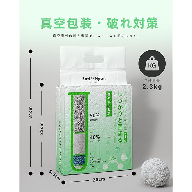 商品名:Zutto Nyan キャッサバ 猫砂 しっかり固まる 天然素材 食品グレード重曹 SAP高分子4in1ミックス 配合 消臭 抗菌 低粉塵 システムトイレ対応 可燃ゴミ処理 室内飼い アパート ペットショップ用【2.3kg × 2袋】