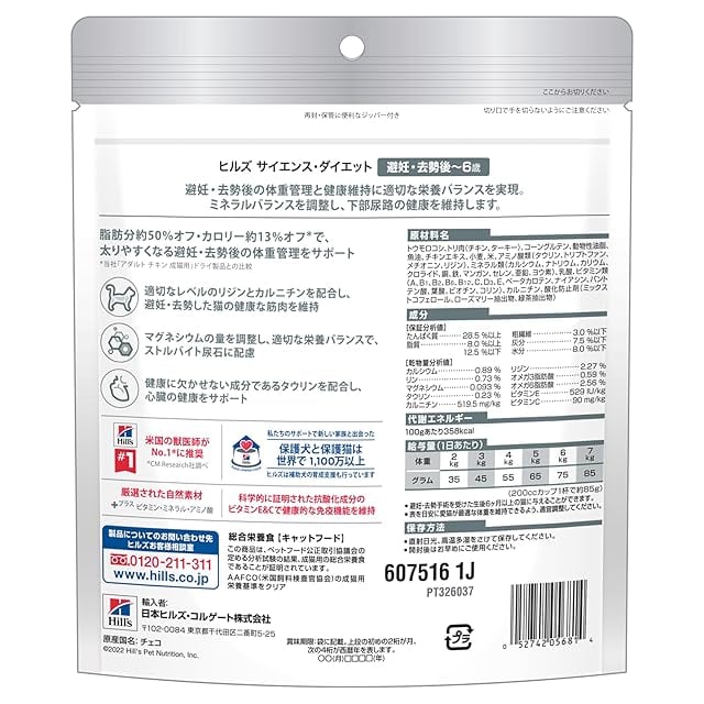 ✅【カロリーオフ】脂肪分約50%オフ・カロリー約13%オフ*で、太りやすくなる避妊・去勢後の体重管理をサポート *当社「アダルト チキン 成猫用」ドライ製品との比較