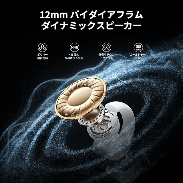 【音の妥協ゼロ・Hi-Fi超高音質】12mmドライバーとコンポジット振動板を搭載。繊細でパワフルな音質を実現し、特に高音と低音の再現性に優れています。シングルマグネットよりも振動板の制御力が強く、音の歪みを最小限に抑え、より自然で臨場感ある音場を提供します。