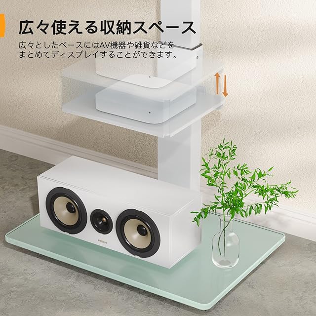 【壁から約4cmほどしかない】Perlegear テレビスタンド ハイタイプが設置後、支柱から壁までの距離は4cmしかありません。普通のテレビ台より省スペースのためデッドスペースが減るので、部屋も開放的で広く見えますし、コード類もスタンドの裏に収まるので、すっきりさせることができます。棚板と台座も充分なスペースがあり、DVDプレーヤーやWi-Fiルーターなどを置けます。テレビやAV機器周りをスッキリさせることが可能です。また、棚板が簡単に取り外し可能なので、テレビ下部のスペースには収納ケースと収納ラックなどを設置できます。