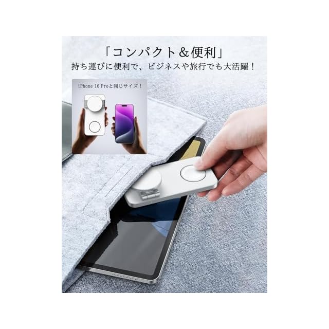 【超コンパクト・折り畳み式】この3in1折りたたみ式マグセーフ充電器は、折りたたんだ状態で長さ15cm、幅7.5cm、厚さ3cmと非常にコンパクトなサイズです。iPhone 16 Proとほぼ同じ大きさで、手のひらやポケットに簡単に収まります。どこへ行くにも便利に持ち運ぶことができ、出張や旅行には必須のアイテムです。