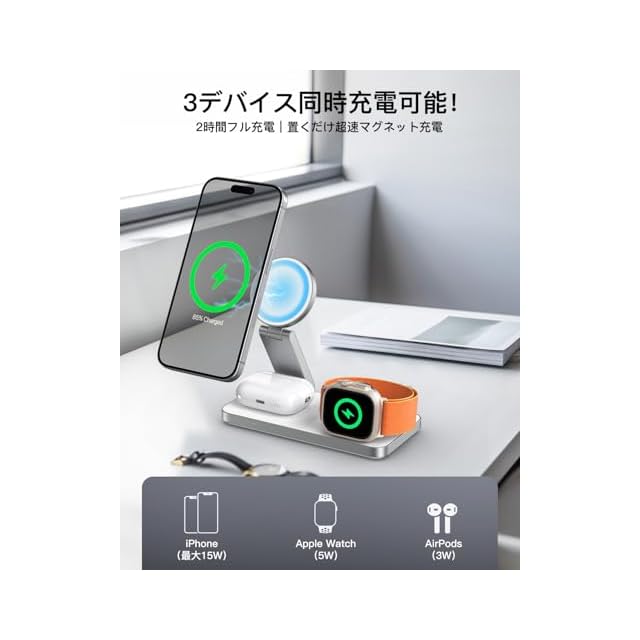 【幅広い互換性】:iPhone17、iPhone 16、iPhone15、iPhone14、iPhone13、iPhone12シリーズ.、他にもQi規格に準拠したデバイスであれば充電可能です。Airpods:AirPods(第4世代ノイズキャンセリング)、AirPods(第3世代)、AirPods(第2世代)、AirPods Pro 2、AirPods Pro Apple Watch:Apple Watch ultra/ Series 10/9/8/7/6/5/4/3/2/1、Apple Watch SE(第1世代・第2世代)、Apple Watch Ultra 2、Apple Watch Ultra
