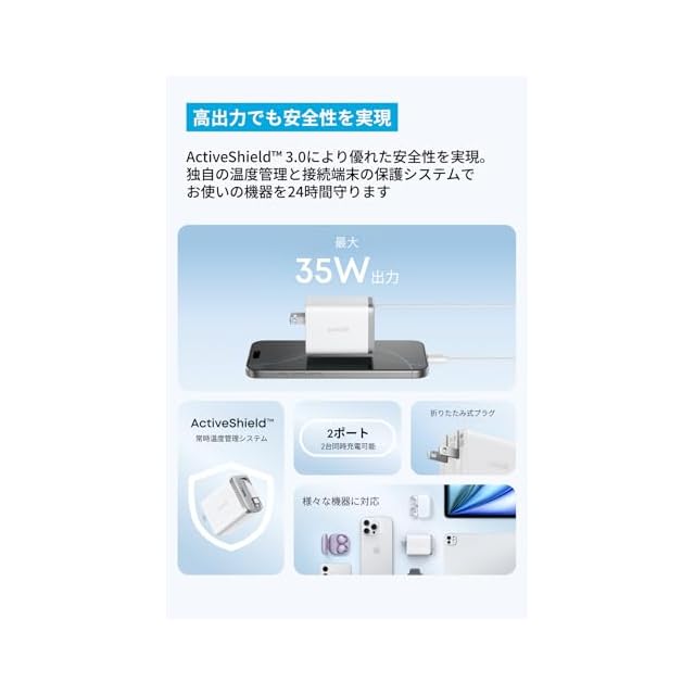 商品名:Anker Nano Charger (35W, 巻取り式 USB-Cケーブル) ホワイト USB PD USB-C 急速充電器【PSE技術基準適合】iPhone 17シリーズ MacBook Air Galaxy Android スマートフォン ノートPC その他各種機器対応