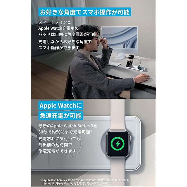 3台まとめてこれ1つ:これ1台で、Qi2対応のiPhone / ワイヤレスイヤホン / Apple Watchの3台を同時に充電可能です。