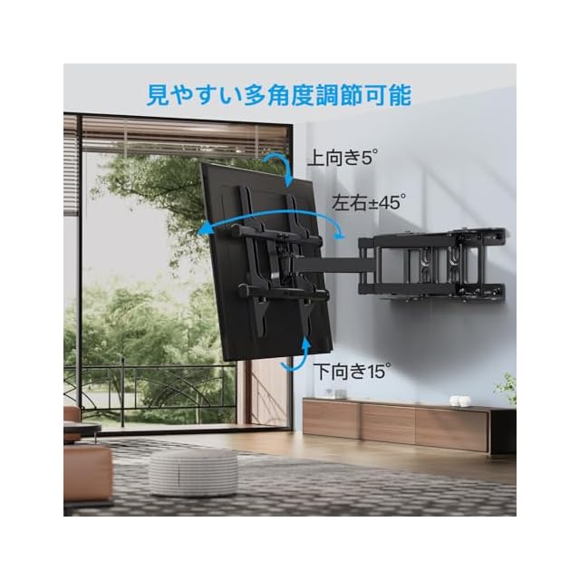 【上下・左右・前後・水平調節】PERLESMITH tv壁掛け金具は、グレアを軽減するためにテレビを上向きに5°、下向きに15°傾けます。左右に45°動かせるもので、普段はリビングから料理をするときはキッチンからなどと、テレビを見る位置に合わせて向きを変えられます。テレビが傾く不安がありません。アームは壁面から76~391mmまで伸ばせるので、視聴場所に合わせたスタイルで設置できます。視聴場所に合わせてスタイルを自由自在に、テレビを楽しもう!
