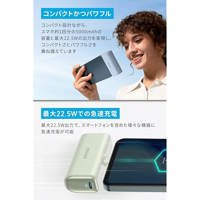 コンパクトかつパワフル:コンパクト設計ながらスマホ約1回分の5000mAhの容量と最大22.5Wの出力を実現。コンパクトさとパワフルさを兼ね備えています。