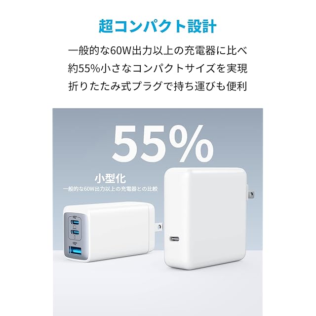 超コンパクト設計:一般的な60W出力以上の充電器に比べ約55%小さなコンパクトサイズを実現。折りたたみ式プラグを採用し、どこにでも気軽に持ち運ぶことができます。