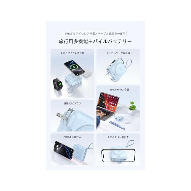 商品名:Philips(フィリップス) モバイルバッテリー コンセント一体型 15000mAh 大容量 Apple Watch対応 MagSafe マグネット式 ワイヤレス充電 アップルウォッチ 2.5W 急速充電 PD 45W出力 ACアダプター usb-c & lightningケーブル内蔵/パススルー機能/プラグ変換可能 PSE認証済 ブルー DLP4351CU