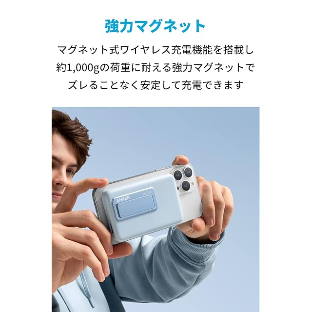 Anker 633 Magnetic Battery (MagGo) <br>強力マグネットでピタッと置くだけ。モバイルバッテリーとして取り外し可能で家でも外出先でもマグネット式ワイヤレス充電が利用可能なワイヤレス充電ステーション <br><br>製品の仕様 <br>サイズ:約 107 x 67 x 18 mm <br>重さ:約218g <br>USB-C入力:5V = 3A / 9V = 2.22A (最大 18W) <br>USB-C出力:5V = 3A / 9V=2.22A (最大 20W) <br>USB-A出力: 5V = 3A / 9V = 2A (最大18W) <br>合計出力: 5V = 3.6A (最大18W) <br>ワイヤレス出力:最大 7.5W <br>※ワイヤレス入力には対応しておりません。 <br>容量:10000mAh <br><br>家でも外出先でも <br>スタンド型マグネット式ワイヤレス充電器とモバイルバッテリーの2通りの充電が可能。ご自宅でも外出先でもマグネット式ワイヤレス充電を利用可能。 <br><br>コンパクトながらパワフル <br>マグネット式ワイヤレス充電に対応した10000mAhの大容量モバイルバッテリー。コンパクトな設計ながらお使いのiPhone 13 / 12シリーズへ約2回充電が可能です。※iPhone13 Proへの満充電回数は約1.8回未満になります (Anker調べ) 。 <br><br>強力マグネットでズレずにピタッとくっつく <br>MagGoシリーズのマグネット式ワイヤレス充電対応モバイルバッテリー。強力マグネットによるマグネット式ワイヤレス充電機能を搭載し、外出時にもお使いのiPhone13 / 12 シリーズをズレることなく安定して充電できます。 <br><br>iPhone 13にも急速充電 <br>USB Power Delivery対応のUSB-Cポートからは最大20Wでの出力が可能でiPhone 13 / 13 Proを急速充電可能です。一般的な5W出力の充電器に比べ、最大3倍速く充電できます。※iPhone 13を0%から30分充電した場合との比較 <br><br>パッケージ内容 <br>Anker 633 Magnetic Battery (MagGo)、USB-C & USB-C ケーブル (0.6m) 、取扱説明書、カスタマーサポート <br><br>対応機種 <br>マグネット式ワイヤレス充電 <br>- iPhone 13 / 13 mini / 13 Pro / 13 Pro Max <br>- iPhone 12 / 12 mini / 12 Pro / 12 Pro Max <br>※マグネット式ワイヤレス充電はiPhone 13 / 12シリーズ以外には対応していません。 <br><br>ご注意 <br>・本製品のバッテリーは2つの5000mAhバッテリーの直列接続となります。 <br>・本製品からの出力はUSB-Cポートから20W、USB-Aポートから18W、マグネット式ワイヤレス充電器から7.5Wとなります。 <br>・本製品はMagSafe非対応のケースには対応していません。ケースをお使いの場合は必ずMagSafe対応のケースをお使いください。 <br>・厚さ約2mmを超えるケースやポップソケット、金属性や磁気をおびたケースは取り外してください。 <br>・本製品はiPhone 13 / 12 シリーズ専用となります。 <br>・MagSafe対応のケースをご使用の場合でも、ケースと本製品の間にポップソケットやクレジットカードなど他の物質を挟む状態でご使用はできかねます。 <br>・MagSafe対応の革製ケースを装着したまま使用するとケースにマグネット部分の丸い跡が付くことがありますので、ご注意ください。 <br>・本製品は最大7.5Wのマグネット式ワイヤレス充電に対応しています。MagSafe規格の15Wではありません。