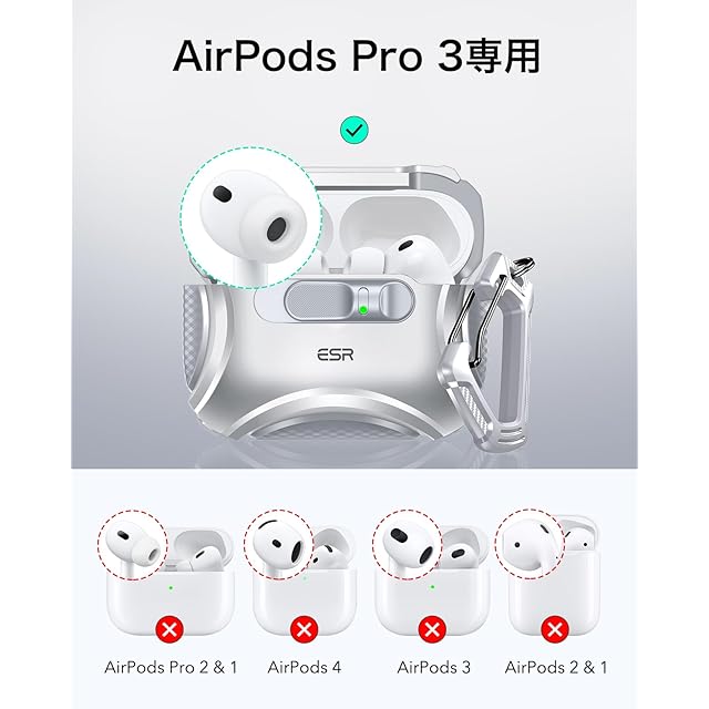 【互換性】:AirPods Pro 3(2025年モデル、USB-Cケーブル対応)専用。AirPods Pro 2/1(2023/2022/2019モデル)には対応していません。イヤホン本体および充電ケースは含まれません。
