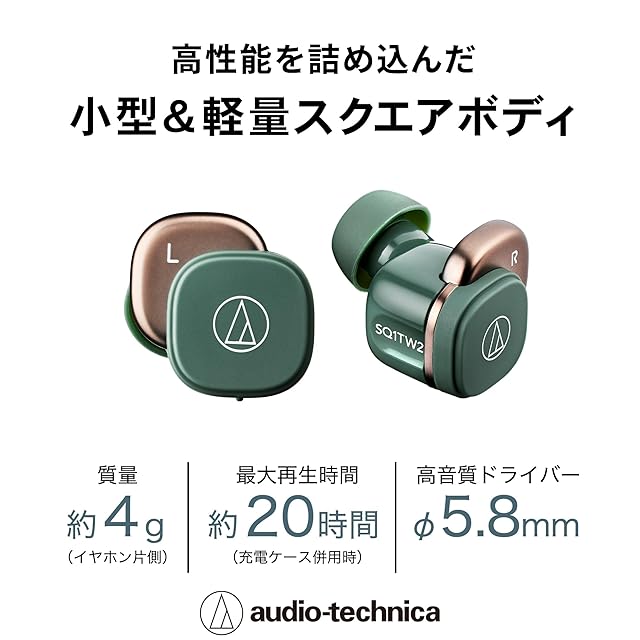 オーディオテクニカ ATH-SQ1TW2 GR ワイヤレスイヤホン bluetooth 小型 軽量 / 最大20時間再生 / 低遅延/外音取込み/マルチポイント/マルチペアリング/防水 IPX5 / ワイヤレス充電 /【国内正規品】グリーン ATH-SQ1TW2 GR