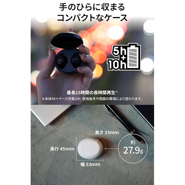 【1日中音楽が楽しめる長時間再生】本体のみで約5時間※1の連続再生と充電ケースでのフル充電(約5時間※1×2回)により合計約15時間※1の長時間再生が可能。※1:使用条件により変わります。