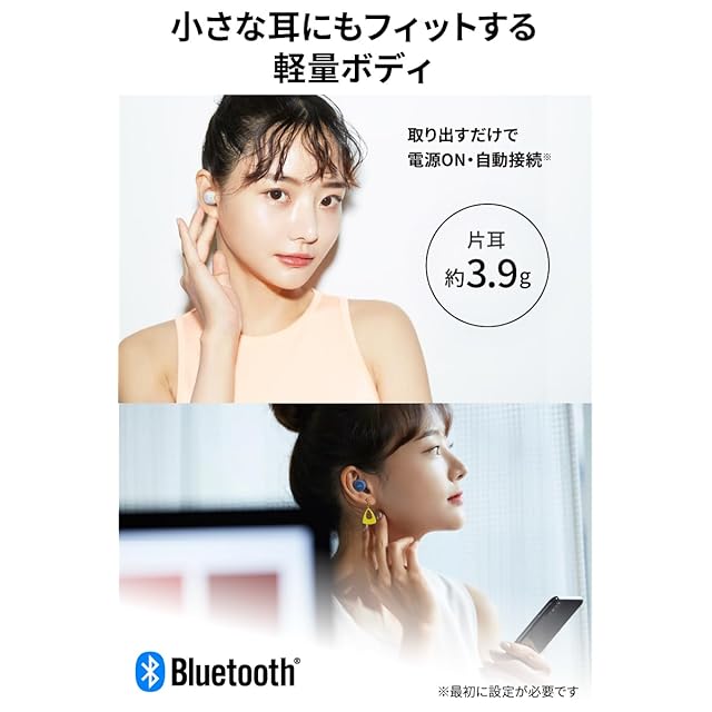 【存在を忘れるくらい、コンパクトで軽い】イヤホン本体は、質量約3.9g(片耳)。装着性を追求し、小型・軽量で耳にぴったりと収まるコンパクトなラウンド型ボディを採用しました。充電ケースは小型で手のひらに収まるラウンド型を採用。質量は約27.9g、イヤホン本体を収納しても合計約35.7gと軽量とし、携帯のしやすさも追求しています。