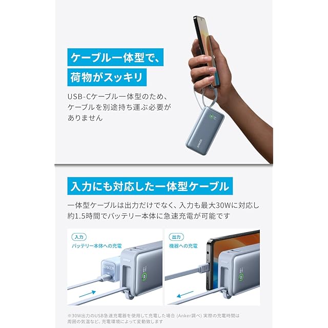 商品名:Anker Nano Power Bank (30W, Built-In USB-C Cable) (モバイルバッテリー 10000mAh 30W出力 大容量 LEDディスプレイ搭載 USB-Cケーブル内蔵 一体型)【PD/PowerIQ搭載/PSE技術基準適合】iPhone 16 / 15 Android MacBook その他各種機器対応 (グレイッシュブルー)