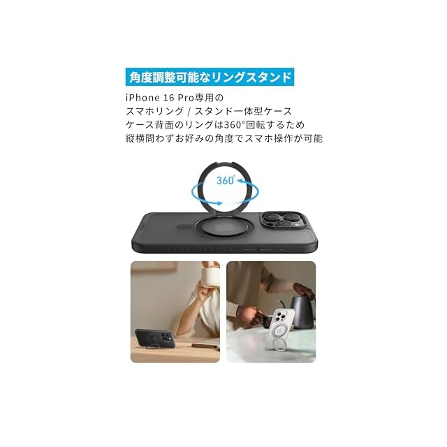 角度調整可能なリングスタンド:iPhone 16 Pro専用スマホリング / スタンド一体型ケース、ケース背面のリングは360°回転するため縦横問わずお好みの角度でスマホ操作が可能です。