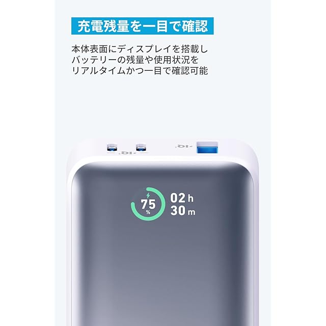 充電残量を一目で確認 : 本体表面にディスプレイを搭載し、バッテリーの残量や使用状況をリアルタイムかつ一目で確認可能です。
