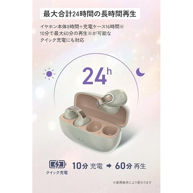 【最大24時間※の長時間再生が可能】 片耳約4.9gと小型・軽量ボディながら、本体のみで最大8時間※の連続再生が可能。さらに、充電ケースによるフル充電(最大16時間※)と合わせると、最大24時間※の長時間再生が可能です。また、充電ケースは約30gの軽量・薄型のコンパクトサイズで、ポケットに収まりやすく、小さなバッグなどでも持ち運びがしやすいようにしました。なお、10分の充電で最大60分※の再生が可能なクイック充電にも対応します。※使用条件により変わります。