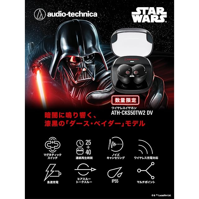 商品名:オーディオテクニカ ATH-CKS50TW2 DV ダース・ベイダー スター・ウォーズ ワイヤレスイヤホン Bluetooth 5.3 ノイズキャンセリング 重低音 ルーカスフィルムスタジオ公認デザイン 限定音声ガイダンス マグネティックスイッチ 約65時間再生 LE Audio 防水防塵 マルチポイント Qiワイヤレス充電