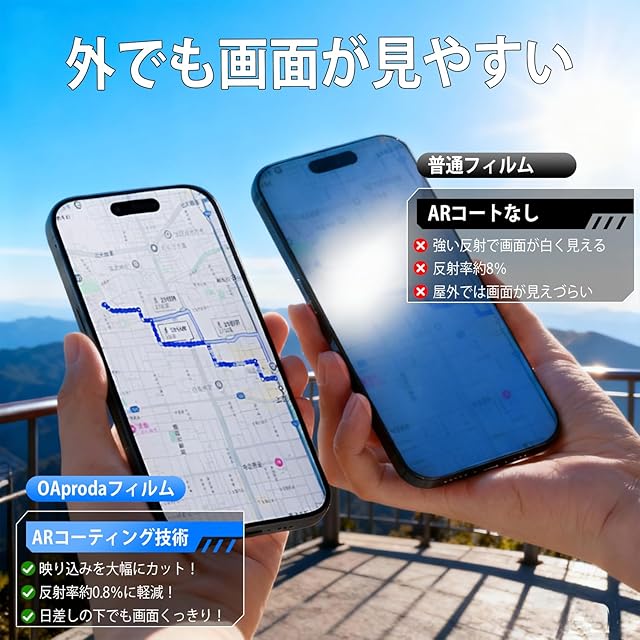 商品名:【1枚が3枚に匹敵・新型ガイド枠】OAproda iPhone用 強化ガラスフィルム、9H硬度、光沢タイプ (2in1(AR+覗き見防止), iPhone17ProMax用)