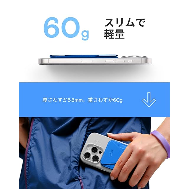【カード1~2枚収納・身軽に外出】スリムなデザインでありながら、クレジットカードや運転免許証などをすっきり収納可能です。スタンドを展開してすぐに取り出せ、畳めるとカードのようにスマホに付け、場所をとりません。