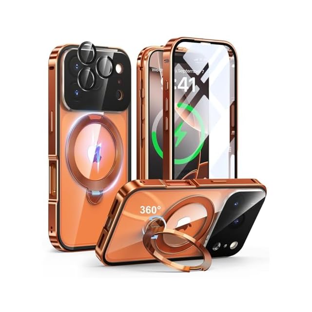 iPhone 17 Pro Max 用 ケース 両面保護 MagSafe対応 光沢CD紋様リング 360°定点回転スタンド 自動ポップアップロック付き カメラレンズフル保護 いphone 17 pro max 用 Gunwon スマホケース アルミ合金バンパー 9H一体型保護フィルム 背面クリア 全面保護 ワイヤレス充電 縦横両対応 アイフォン 17 プロ マックス 用 携帯ケース「オレンジ」