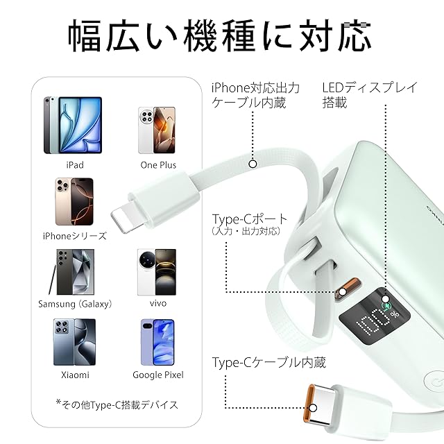 内蔵ケーブル&急速充電対応:ケーブル忘れゼロ!内蔵Type-Cケーブルは最大22.5W、iPhone対応ケーブルは最大12Wの急速充電対応。使いたい時だけケーブルを引き出し、使わない時はスッキリ収納。iPhoneもAndroidもこれ1台でOK、いつでもどこでもスマートに充電可能。