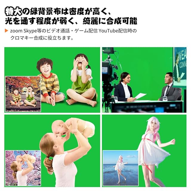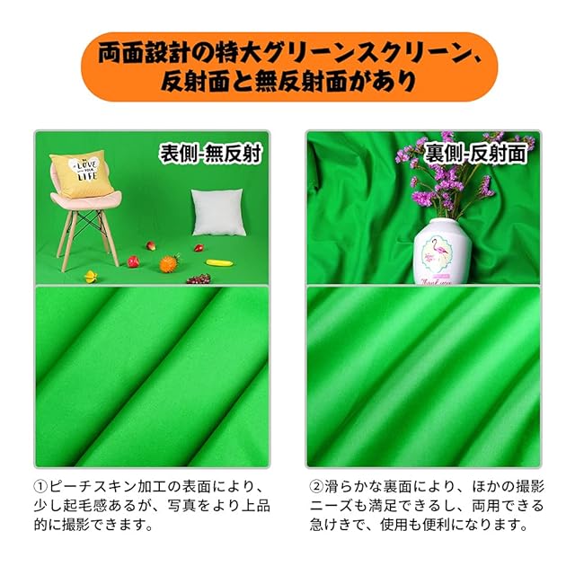 【両面設計-反射面と無反射面があり 】:このクロマキー グリーンバック様々な撮影ニーズを満足できるように、反射面と無反射面がある両面の設計を採用しており、無駄な光の反射を防ぎ、光沢感を抑えながら撮影対象を自然に引き立てられます。★このクロマキー 布の表面はピーチスキン加工の設計で、少し起毛感があり、写真をより上品的に撮影できます。このグリーンスクリーンの裏面は滑らかな設計で、ほかの撮影ニーズも満足できます。