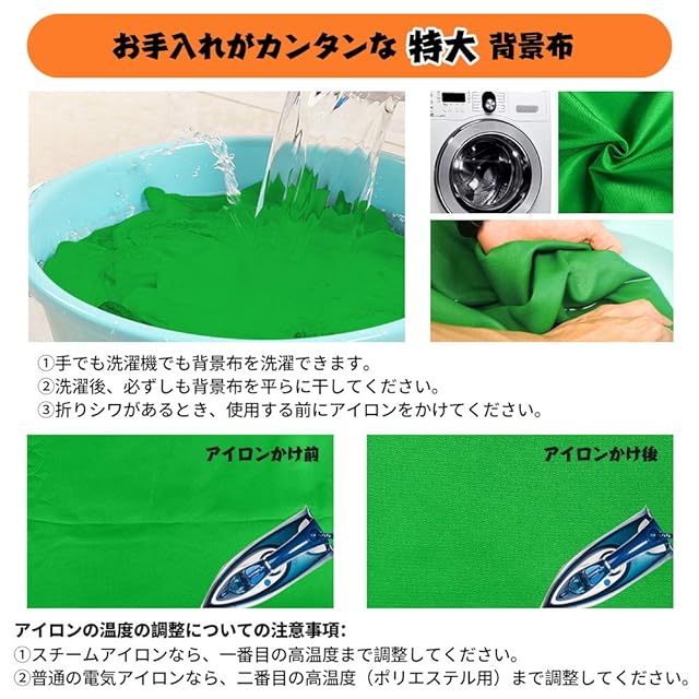 【洗濯簡単&アイロンかけ可能】:この3m x 6mのクロマキー グリーン背景は洗濯できるほかに、アイロンかけもできます。大きいサイズなので、折り畳んで出荷しておりシワがついてあります。もし製品を開封してからシワがつくことが気になる場合、低温スチームアイロンで背景布にアイロンをかければ、シワが自然に伸びます。★また汚れる場合、グリーンシートを手でも洗濯機でも洗濯できるので、非常に取り扱いやすいです。※ご注意:①普通のアイロンでは、高温~中温に控えてください。高温では、長時間使用すると縮んだり、グリーンスクリーンが傷む可能性があるので、使用する際にご注意ください。②もしアイロンでもシワを取れにくい場合、洗濯機で洗濯してから、濡れたままアイロンをかけると、より効果的にシワを伸ばせます。