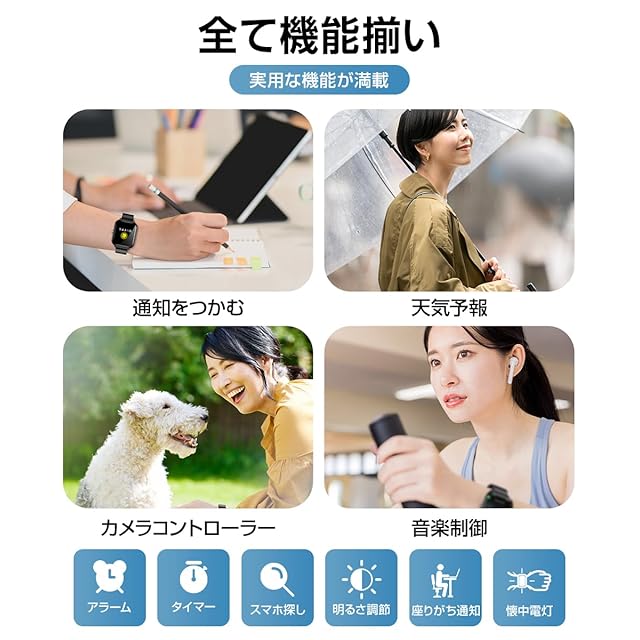 【着信/アプリ通知・カスタム文字盤・実用な機能満載】スマートウォッチは、Line、Twitter、Ins、Facebook、Instagram、着信などの通知は、全部バイブレーションで通知されます。一切の大事な連絡を絶対に見逃しません。また、メッセージ内容や相手の名前または対応するアプリのアイコンも表示されます。独自の時計のスタイルの文字盤、専用アプリFitCloudProには200種類以上の文字盤を自由に切り替えることができ、お好みの写真を文字盤として使用することも可能です。毎日のお気持ちによって、文字盤スタイルを取り替えましょう。その上、着信通知/拒否、輝度調整、カメラ遠隔、スマホ探す、懐中電灯、天気予報、音楽制御/再生、腕上げ点灯など実用な機能が備えて、日常生活をサポートします。